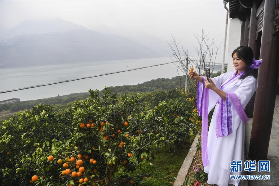 12月28日,工作人员在重庆市奉节县安坪镇三坨村通过电商直播平台推介脐橙产品。新华社记者 王全超 摄