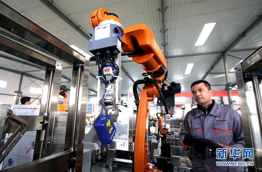 12月29日,在邯郸市永年工业园区,一家高新技术企业的员工在调试机器人装箱程序。近年来,河北省邯郸市永年区坚持新发展理念,以供给侧结构性改革为主线,加快新旧动能转换,打造高新技术产业集群,助推当地经济高质量发展。新华社记者 王晓 摄