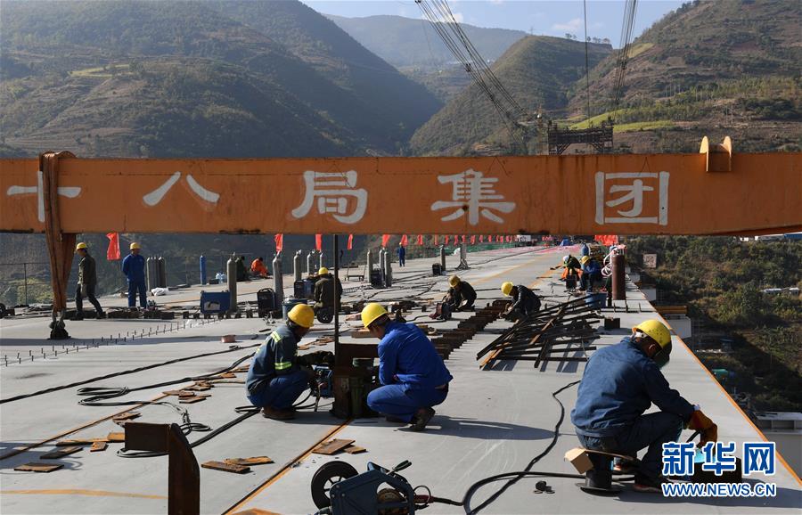 12月29日,建设者在大瑞铁路怒江特大桥上施工。新华社记者 杨宗友 摄
