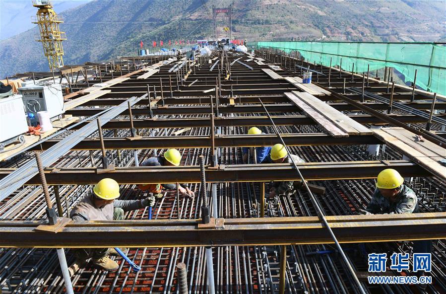 12月29日,建设者在大瑞铁路怒江特大桥上绑扎钢筋。新华社记者 杨宗友 摄