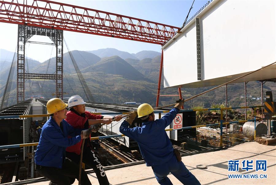 12月29日,建设者在吊装大瑞铁路怒江特大桥钢梁。新华社记者 杨宗友 摄