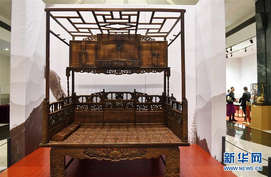 这是展出的黄花梨凤凰牡丹架子床(12月29日摄)。12月29日,由海南省博物馆和福建博物院推出的“教我如何不爱她——海南黄花梨艺术大展”暨“博物馆之夜”在福建博物院开幕,共展出海南黄花梨藏品150件。本次展览不仅运用影像多媒体技术设计了沉浸式体验厅,还允许观众触摸部分展品,感受海南黄花梨的物料、工艺之美。 新华社记者林善传摄