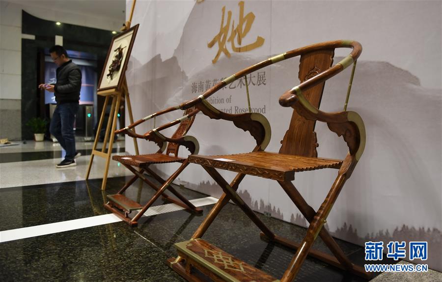 这是展出的黄花梨椅子(12月29日摄)。12月29日,由海南省博物馆和福建博物院推出的“教我如何不爱她——海南黄花梨艺术大展”暨“博物馆之夜”在福建博物院开幕,共展出海南黄花梨藏品150件。本次展览不仅运用影像多媒体技术设计了沉浸式体验厅,还允许观众触摸部分展品,感受海南黄花梨的物料、工艺之美。 新华社记者林善传摄