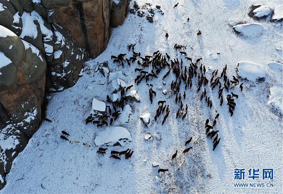 这是12月29日拍摄的牧业冬季大转场表演(无人机照片)。 当日,第二届萨吾尔冬牧文化旅游节在新疆吉木乃县草原石城景区开幕。 新华社记者 沙达提 摄
