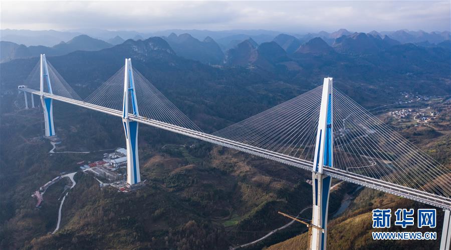 这是12月29日拍摄的贵州平塘特大桥(无人机照片)。目前,贵州平塘至罗甸高速公路控制性工程平塘特大桥已经通过验收,将于近日全桥通车。平塘特大桥全长2135米,桥面宽30.2米,规划双向4车道,是一座三塔双索面叠合梁斜拉桥。三座桥塔的高度分别为320米、332米和298米,相当于在峡谷之中建了三座100多层高的大楼。新华社记者 陶亮 摄