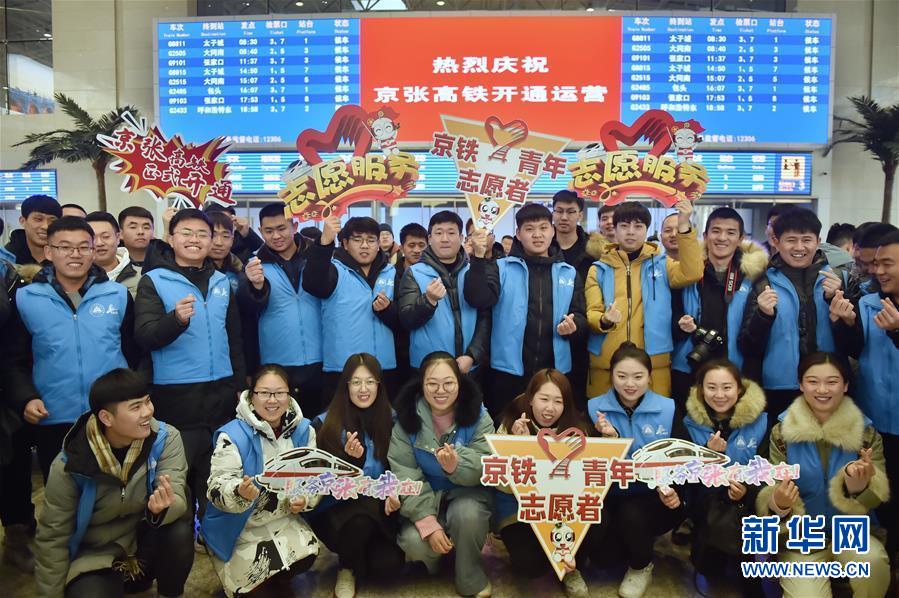 12月30日,青年志愿者在北京北站候车室合影留念。 当日,北京至张家口高速铁路开通运营,崇礼铁路同步通车。 新华社发(彭子洋 摄)