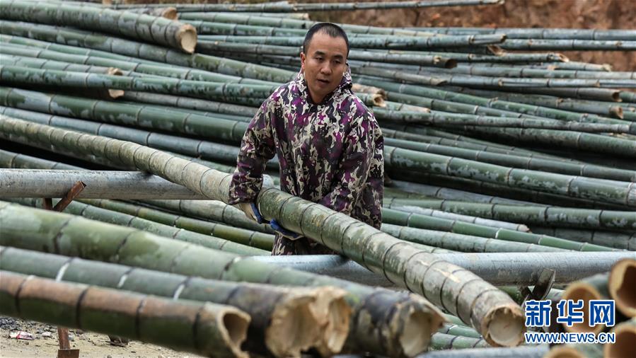 当地贫困群众在融安县一家竹木生产企业搬运竹子(12月28日摄)。新华社记者 张爱林 摄