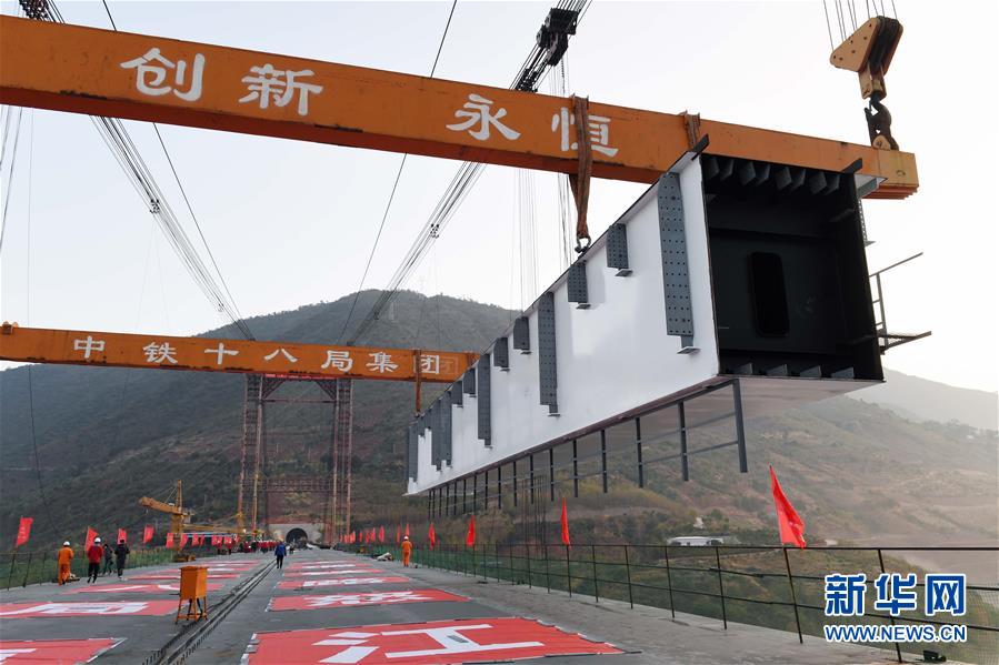 12月30日,建设者在大瑞铁路怒江特大桥上吊装最后一片钢箱梁。 新华社记者杨宗友摄