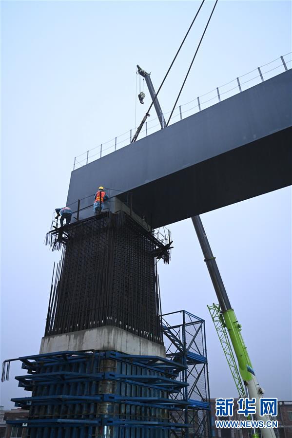 12月30日,在福建省惠安县辋川镇的新建福厦铁路5标段,首片上跨既有线门式墩钢盖梁在吊装中。 新华社记者 林善传 摄