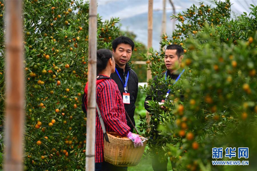 12月30日,纪检监察干部(中、右)在柳州市融安县大将镇东潭村了解金桔产业奖补资金发放情况。新华社记者 黄孝邦 摄