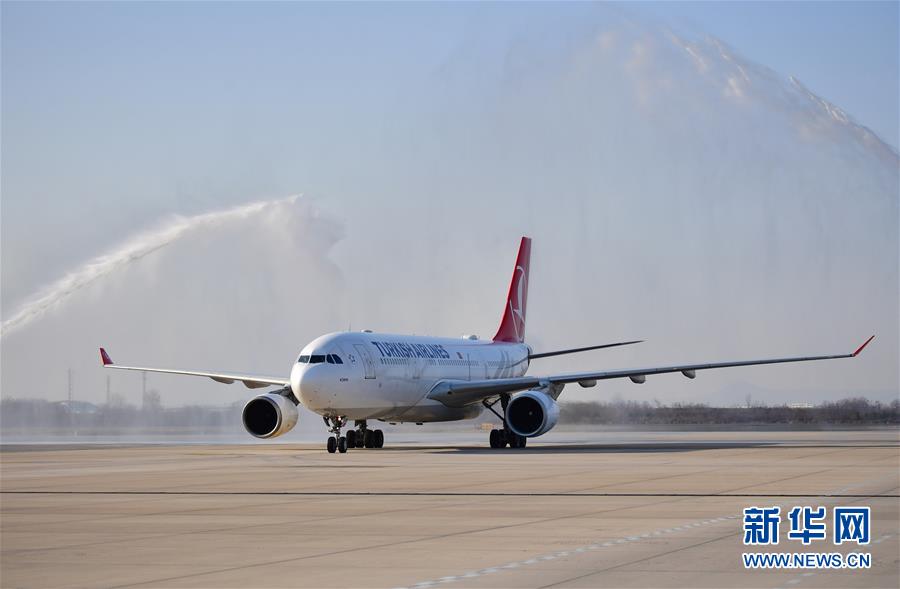 12月30日,西安至伊斯坦布尔航线首班航班降落西安咸阳国际机场,并通过水门。 新华社记者 邵瑞 摄