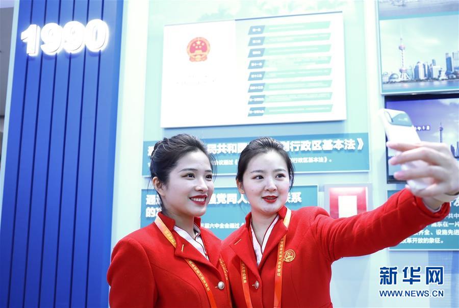 12月31日,两名讲解员在庆祝中华人民共和国成立70周年大型成就展展厅内自拍。新华社记者 张玉薇 摄