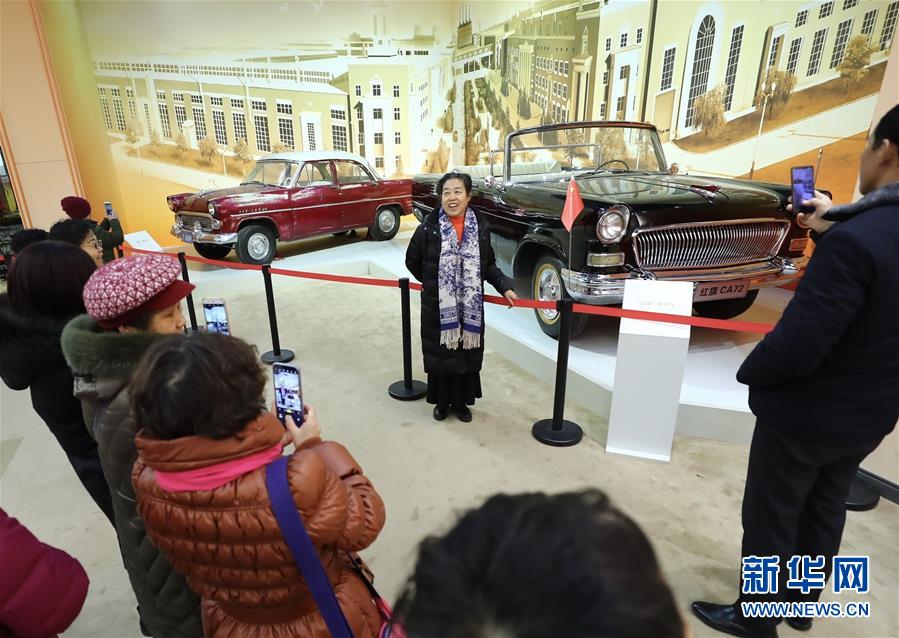 12月31日,观众在庆祝中华人民共和国成立70周年大型成就展上与中国第一台“红旗”轿车合影。新华社记者 张玉薇 摄