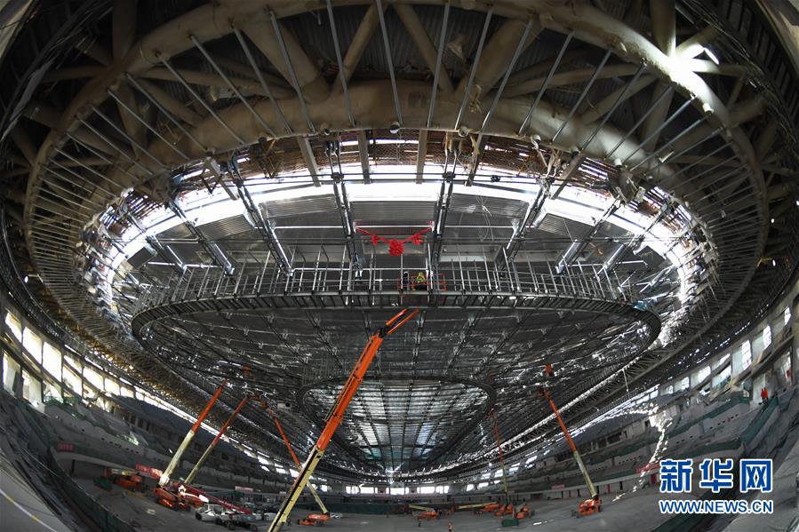 12月31日,施工人员在实现封顶封围的国家速滑馆施工现场工作。新华社记者鞠焕宗摄