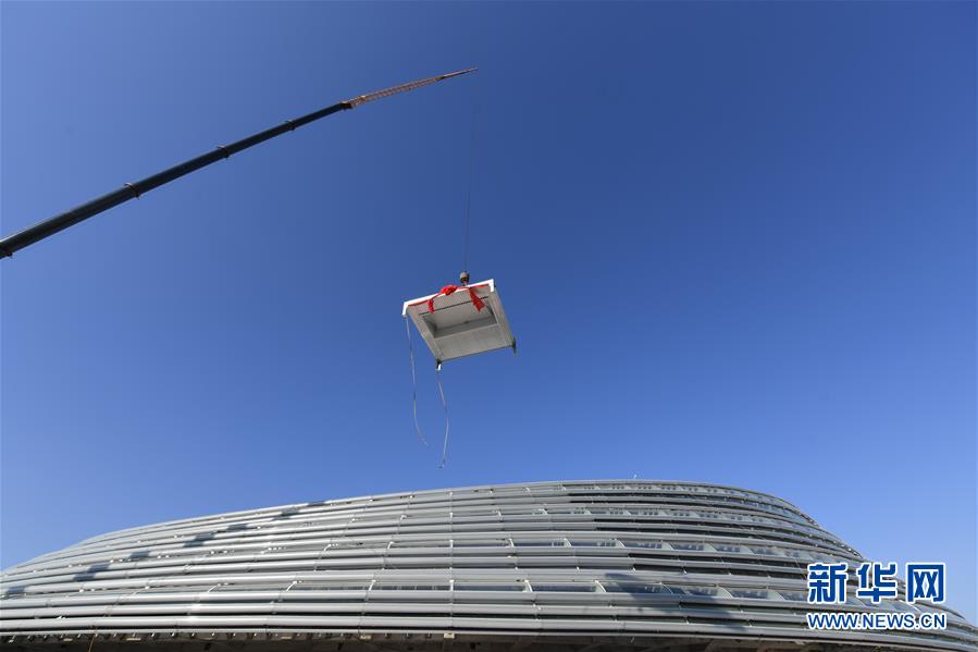 12月31日,施工人员在国家速滑馆施工现场起吊最后一块待安装的屋面单元板块。新华社记者鞠焕宗摄
