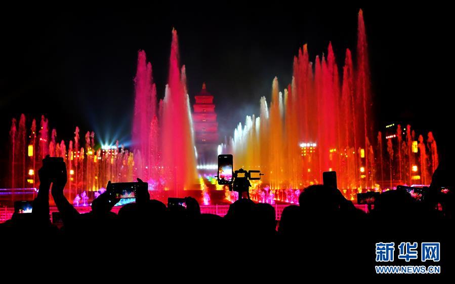 西安大雁塔北广场上演的水舞光影秀(2019年12月31日摄)。新华社记者 刘潇 摄