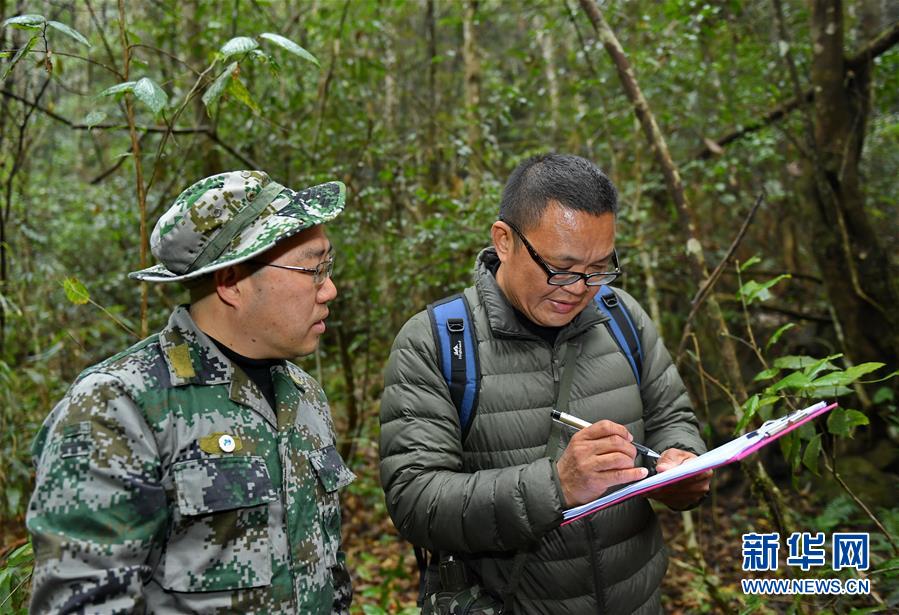 2019年12月31日,科研人员在武夷山国家公园自然保护区内考查。 近年来,福建武夷山国家公园不断扩大野生动物监测范围,在自然保护区和过渡地带加紧布设红外相机。截至2019年12月31日,武夷山国家公园在黄岗山、挂墩等4条野生动物监测线路共布设红外相机55台,陆续回收监测记录2.72万张、条照片和影像,黄腹角雉、勺鸡、黑熊、苏门羚等一批珍贵野生动物走进人们的视野,其中黑熊第一次被发现。 新华社记者 张国俊 摄
