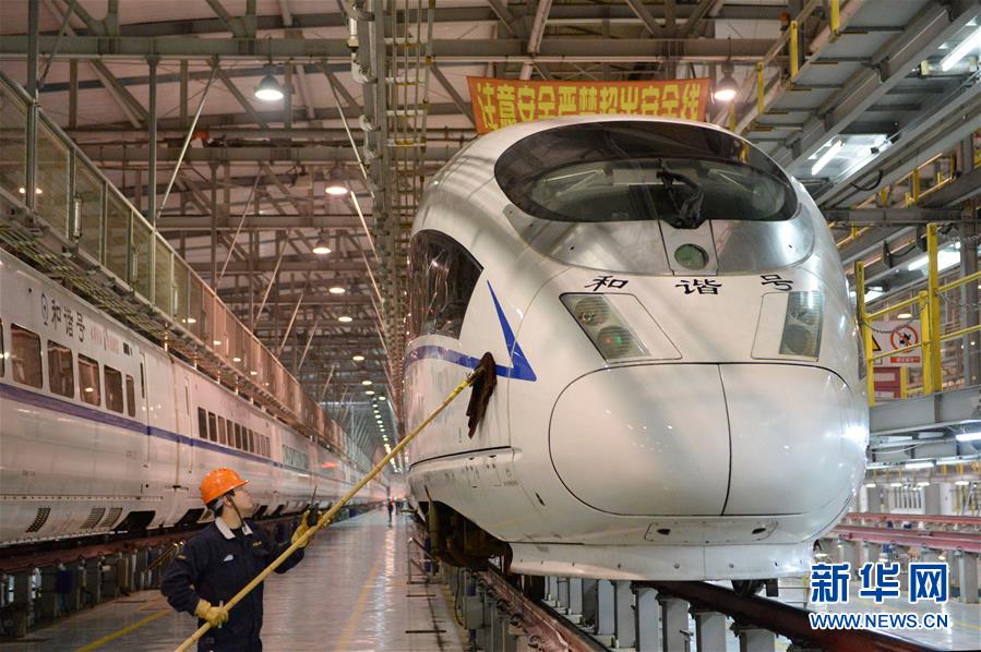 2019年12月31日晚,工作人员在清洗动车组。新华社发(黄博涵 摄)