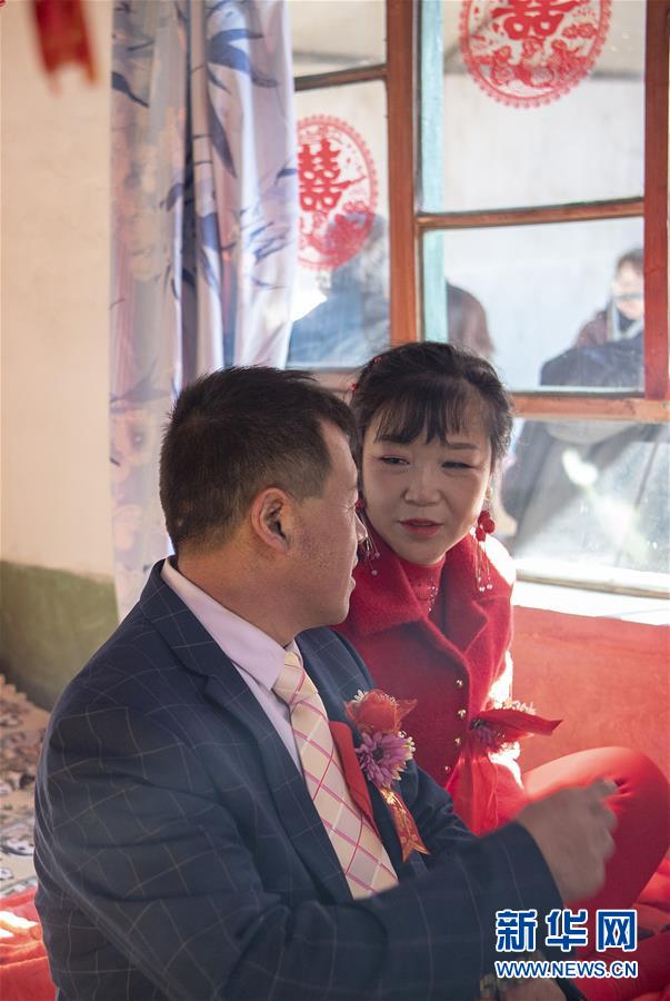 在和顺县李阳镇下石勒村,新郎马爱明和新娘温丽芳在家中交流(2019年12月31日摄)。 农历腊月初六,是山西省和顺县李阳镇下石勒村45岁的马爱明娶媳妇的日子。 地处太行山区的下石勒村曾深陷贫困,“地下无资源、地上没产业”是这里的真实写照。2013年,村里638口人中有511口属贫困人口。村民在贫瘠的坡地上种的玉米、谷子等仅够糊口,外村女子都不愿嫁到这里。和村里多数人一样,贫困户马爱明不得不在农闲时出去打工补贴家用。东走走、西走走,马爱明没攒下钱,也没遇见合适的人,婚事一拖再拖,成了大龄“光棍”。 2013年以来,在国家强有力的政策帮扶和基层党组织的带领下,下石勒村以合作社的形式发展起肉牛养殖、双孢菇种植、万寿菊种植等集体产业。下石勒村经济有了起色,外出打工的村民纷纷回村。马爱明加入了村里的建筑队,闲时还到种植专业合作社打工,一年四季都有活干。加上土地流转的收入,马爱明一年能收入三万多元。2016年,下石勒村实现整村脱贫。 2019年,马爱明结识了在下石勒村肉鸡养殖专业合作社打工的李阳镇南李阳村村民温丽芳,马爱明的朴实、善良、勤劳打动了温丽芳,两人擦出了爱情的火花。 腊月初六这天,下石勒村锣鼓喧天,唢呐齐鸣。在乡亲们的见证下,马爱明手牵新娘,大声宣布:“我脱单了!我的幸福生活开始了!” 新华社记者 杨晨光 摄
