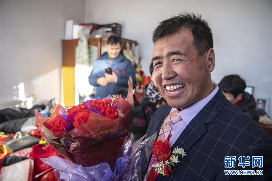 在和顺县李阳镇南李阳村,新郎马爱明在新娘家里接亲(2019年12月31日摄)。 农历腊月初六,是山西省和顺县李阳镇下石勒村45岁的马爱明娶媳妇的日子。 地处太行山区的下石勒村曾深陷贫困,“地下无资源、地上没产业”是这里的真实写照。2013年,村里638口人中有511口属贫困人口。村民在贫瘠的坡地上种的玉米、谷子等仅够糊口,外村女子都不愿嫁到这里。和村里多数人一样,贫困户马爱明不得不在农闲时出去打工补贴家用。东走走、西走走,马爱明没攒下钱,也没遇见合适的人,婚事一拖再拖,成了大龄“光棍”。 2013年以来,在国家强有力的政策帮扶和基层党组织的带领下,下石勒村以合作社的形式发展起肉牛养殖、双孢菇种植、万寿菊种植等集体产业。下石勒村经济有了起色,外出打工的村民纷纷回村。马爱明加入了村里的建筑队,闲时还到种植专业合作社打工,一年四季都有活干。加上土地流转的收入,马爱明一年能收入三万多元。2016年,下石勒村实现整村脱贫。 2019年,马爱明结识了在下石勒村肉鸡养殖专业合作社打工的李阳镇南李阳村村民温丽芳,马爱明的朴实、善良、勤劳打动了温丽芳,两人擦出了爱情的火花。 腊月初六这天,下石勒村锣鼓喧天,唢呐齐鸣。在乡亲们的见证下,马爱明手牵新娘,大声宣布:“我脱单了!我的幸福生活开始了!” 新华社记者 杨晨光 摄