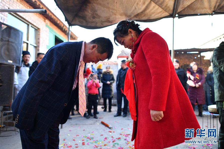 在和顺县李阳镇下石勒村,新郎马爱明和新娘温丽芳在婚礼仪式上(2019年12月31日摄)。 农历腊月初六,是山西省和顺县李阳镇下石勒村45岁的马爱明娶媳妇的日子。 地处太行山区的下石勒村曾深陷贫困,“地下无资源、地上没产业”是这里的真实写照。2013年,村里638口人中有511口属贫困人口。村民在贫瘠的坡地上种的玉米、谷子等仅够糊口,外村女子都不愿嫁到这里。和村里多数人一样,贫困户马爱明不得不在农闲时出去打工补贴家用。东走走、西走走,马爱明没攒下钱,也没遇见合适的人,婚事一拖再拖,成了大龄“光棍”。 2013年以来,在国家强有力的政策帮扶和基层党组织的带领下,下石勒村以合作社的形式发展起肉牛养殖、双孢菇种植、万寿菊种植等集体产业。下石勒村经济有了起色,外出打工的村民纷纷回村。马爱明加入了村里的建筑队,闲时还到种植专业合作社打工,一年四季都有活干。加上土地流转的收入,马爱明一年能收入三万多元。2016年,下石勒村实现整村脱贫。 2019年,马爱明结识了在下石勒村肉鸡养殖专业合作社打工的李阳镇南李阳村村民温丽芳,马爱明的朴实、善良、勤劳打动了温丽芳,两人擦出了爱情的火花。 腊月初六这天,下石勒村锣鼓喧天,唢呐齐鸣。在乡亲们的见证下,马爱明手牵新娘,大声宣布:“我脱单了!我的幸福生活开始了!” 新华社记者 詹彦 摄