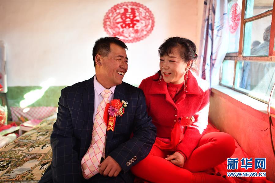 在和顺县李阳镇下石勒村,新郎马爱明和新娘温丽芳在炕上聊天(2019年12月31日摄)。 农历腊月初六,是山西省和顺县李阳镇下石勒村45岁的马爱明娶媳妇的日子。 地处太行山区的下石勒村曾深陷贫困,“地下无资源、地上没产业”是这里的真实写照。2013年,村里638口人中有511口属贫困人口。村民在贫瘠的坡地上种的玉米、谷子等仅够糊口,外村女子都不愿嫁到这里。和村里多数人一样,贫困户马爱明不得不在农闲时出去打工补贴家用。东走走、西走走,马爱明没攒下钱,也没遇见合适的人,婚事一拖再拖,成了大龄“光棍”。 2013年以来,在国家强有力的政策帮扶和基层党组织的带领下,下石勒村以合作社的形式发展起肉牛养殖、双孢菇种植、万寿菊种植等集体产业。下石勒村经济有了起色,外出打工的村民纷纷回村。马爱明加入了村里的建筑队,闲时还到种植专业合作社打工,一年四季都有活干。加上土地流转的收入,马爱明一年能收入三万多元。2016年,下石勒村实现整村脱贫。 2019年,马爱明结识了在下石勒村肉鸡养殖专业合作社打工的李阳镇南李阳村村民温丽芳,马爱明的朴实、善良、勤劳打动了温丽芳,两人擦出了爱情的火花。 腊月初六这天,下石勒村锣鼓喧天,唢呐齐鸣。在乡亲们的见证下,马爱明手牵新娘,大声宣布:“我脱单了!我的幸福生活开始了!” 新华社记者 詹彦 摄