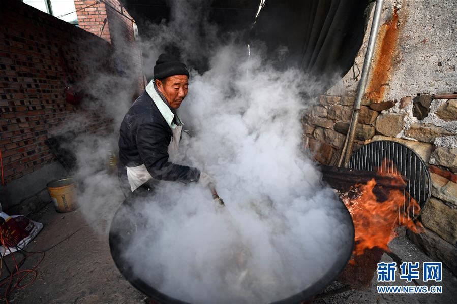 在和顺县李阳镇下石勒村,村民在为马爱明的婚礼准备菜品(2019年12月30日摄)。 农历腊月初六,是山西省和顺县李阳镇下石勒村45岁的马爱明娶媳妇的日子。 地处太行山区的下石勒村曾深陷贫困,“地下无资源、地上没产业”是这里的真实写照。2013年,村里638口人中有511口属贫困人口。村民在贫瘠的坡地上种的玉米、谷子等仅够糊口,外村女子都不愿嫁到这里。和村里多数人一样,贫困户马爱明不得不在农闲时出去打工补贴家用。东走走、西走走,马爱明没攒下钱,也没遇见合适的人,婚事一拖再拖,成了大龄“光棍”。 2013年以来,在国家强有力的政策帮扶和基层党组织的带领下,下石勒村以合作社的形式发展起肉牛养殖、双孢菇种植、万寿菊种植等集体产业。下石勒村经济有了起色,外出打工的村民纷纷回村。马爱明加入了村里的建筑队,闲时还到种植专业合作社打工,一年四季都有活干。加上土地流转的收入,马爱明一年能收入三万多元。2016年,下石勒村实现整村脱贫。 2019年,马爱明结识了在下石勒村肉鸡养殖专业合作社打工的李阳镇南李阳村村民温丽芳,马爱明的朴实、善良、勤劳打动了温丽芳,两人擦出了爱情的火花。 腊月初六这天,下石勒村锣鼓喧天,唢呐齐鸣。在乡亲们的见证下,马爱明手牵新娘,大声宣布:“我脱单了!我的幸福生活开始了!” 新华社记者 詹彦 摄