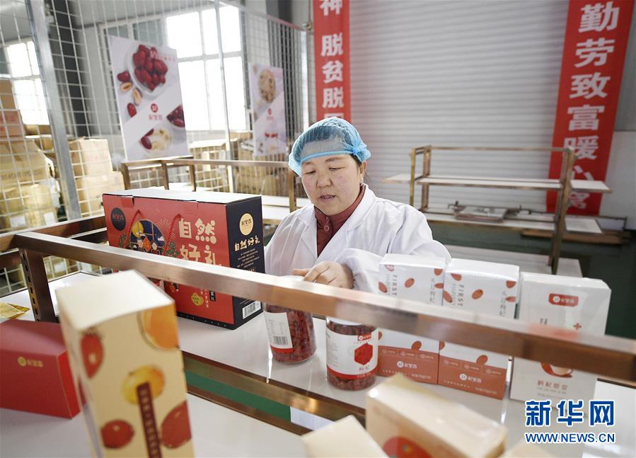 1月1日,高润弟在宁夏银川市永宁县闽宁镇原隆村扶贫车间整理货物。新华社记者 王鹏 摄