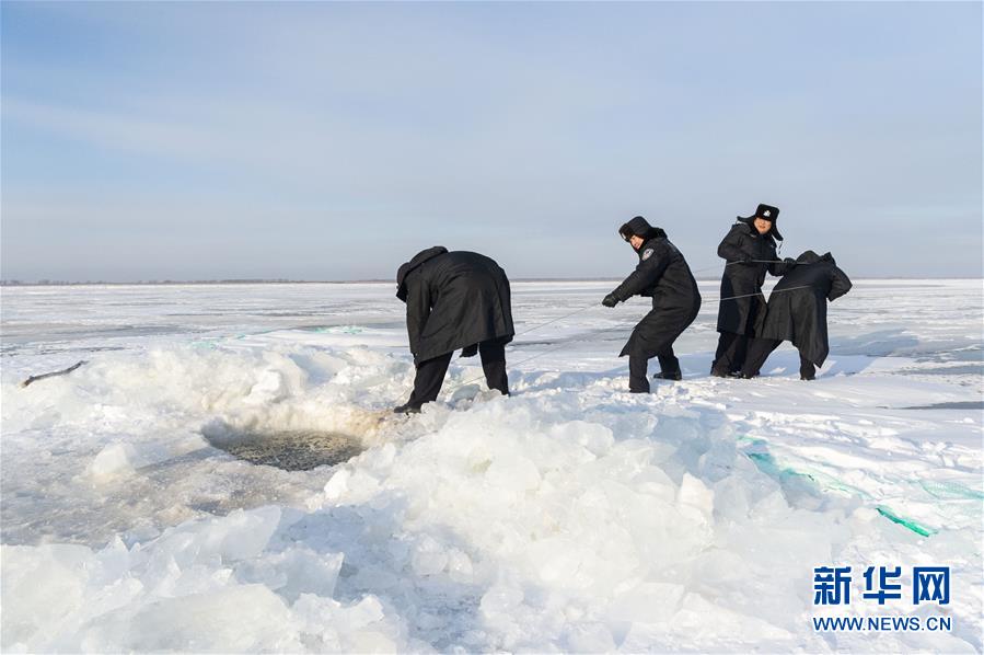 黑瞎子岛边境派出所的民警们在封冻的黑龙江上起获非法捕捞网具(2019年12月28日摄)。新华社发(谢剑飞 摄)