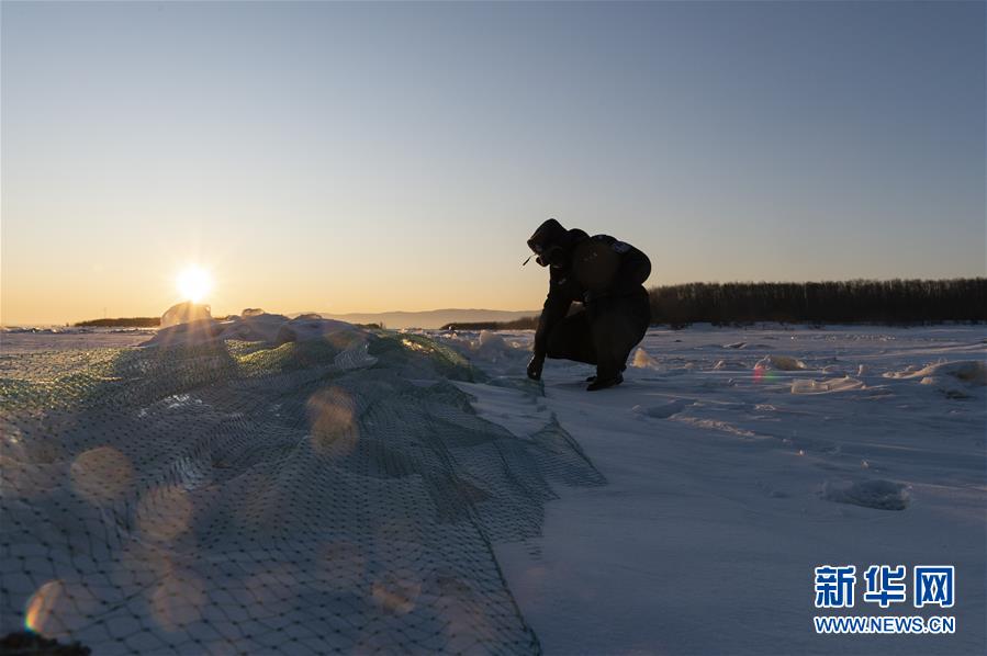 一名黑瞎子岛边境派出所的民警在封冻的黑龙江江面上查看非法捕捞网具(2019年12月20日摄)。新华社发(谢剑飞 摄)