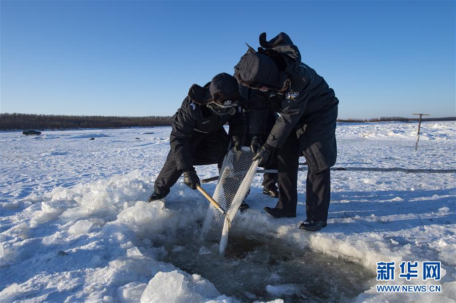 黑瞎子岛边境派出所的民警们在封冻的黑龙江江面上销毁非法捕捞网具(2019年12月20日摄)。新华社发(谢剑飞 摄)