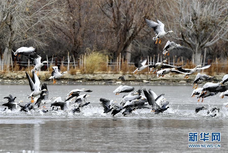 拉鲁湿地里的斑头雁(1月1日摄)。新华社记者 张汝锋 摄