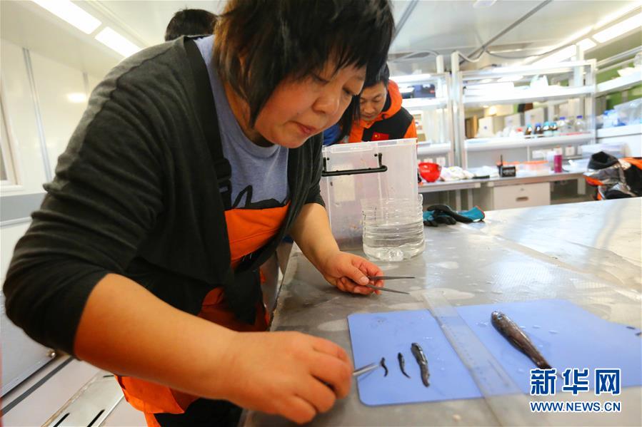 1月1日,科考队员张洁在处理鱼类样品。新华社记者 刘诗平 摄