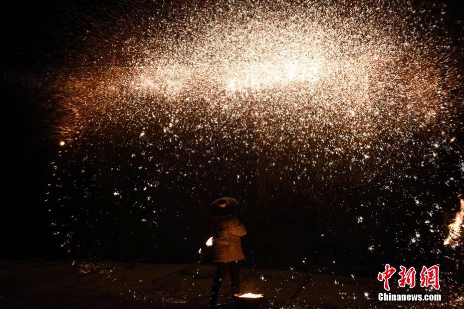 打树花是用熔化的铁水泼洒迸溅形成万朵火花,因犹如枝繁叶茂的树冠而称之为“树花”。中新社记者 孙自法 摄