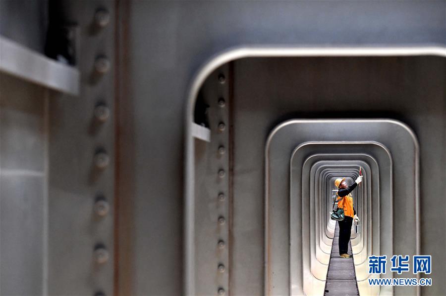 1月2日,顿麒在大桥钢梁洞内使用检查锤检查高强度螺栓。新华社记者 李安 摄