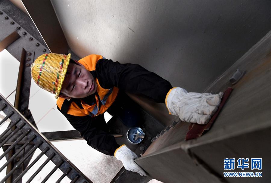 1月2日,顿麒在对大桥钢梁洞内锈蚀部分进行除锈处理。新华社记者 李安 摄