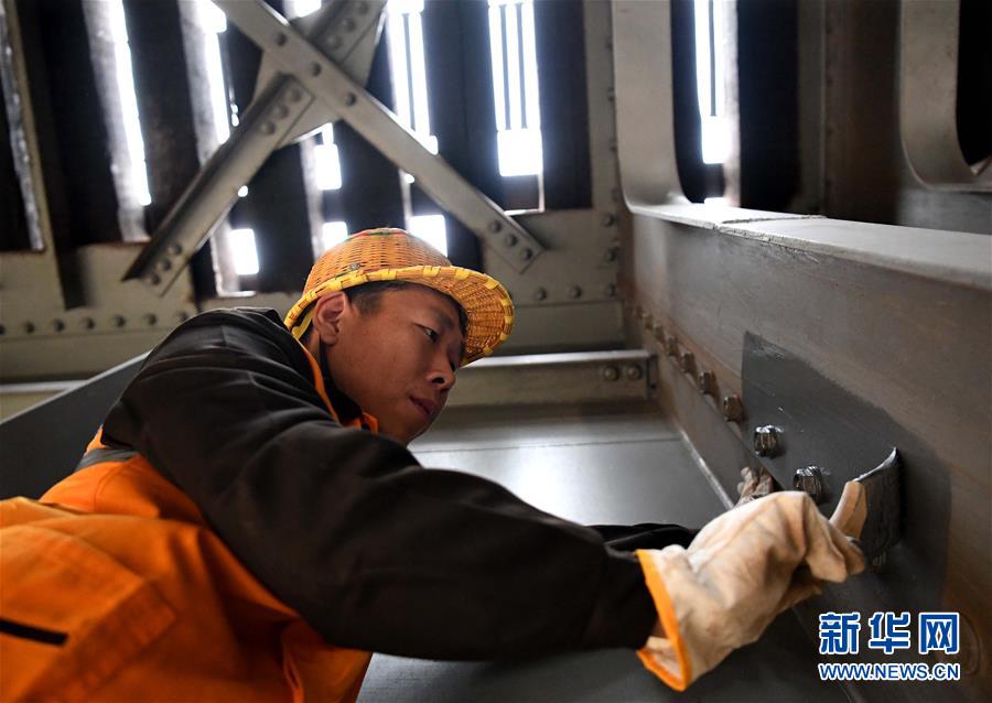 1月2日,顿麒在大桥钢梁洞内进行补漆作业。新华社记者 李安 摄