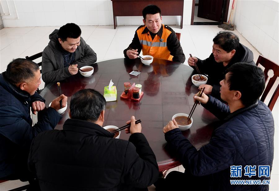 1月2日,顿麒(上中)和工友一起喝腊八粥。新华社记者 李安 摄