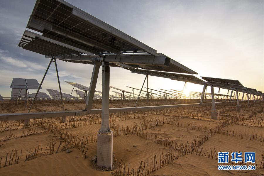 在内蒙古库布其沙漠腹地的一处光伏治沙基地,光伏板下已设置沙障(2019年6月5日摄)。新华社记者 李云平 摄