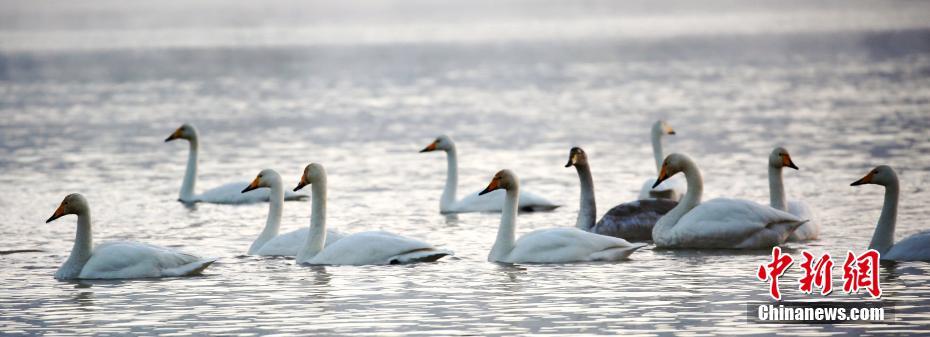 大天鹅飞抵黄河库区 悠闲嬉戏构成山水画卷