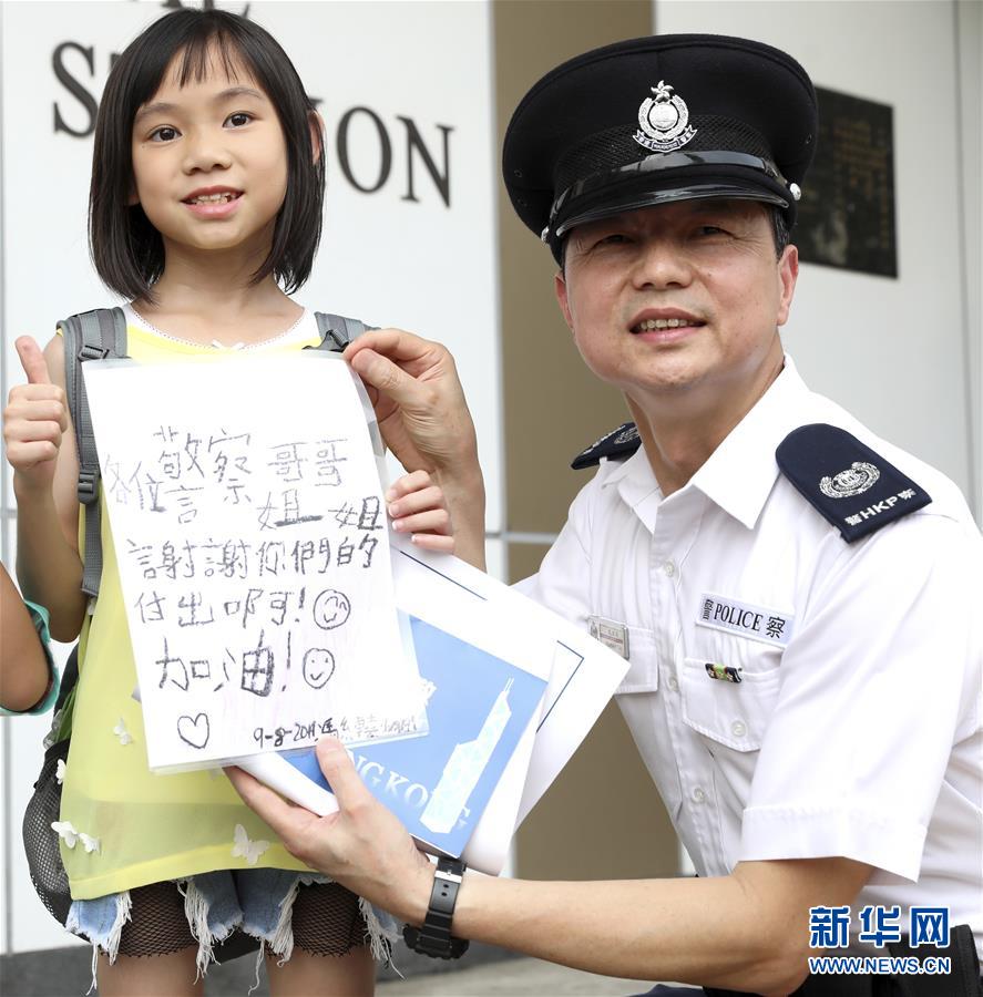 2019年8月10日,在香港中区警署,小朋友也来为警察加油。新华社记者 吴晓初 摄