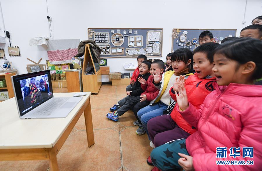 杭州浙大幼儿园西溪分园小朋友与西藏道布龙双语幼儿园的小朋友们视频聊天,互致问候(2019年12月24日摄)。新华社记者 徐昱 摄