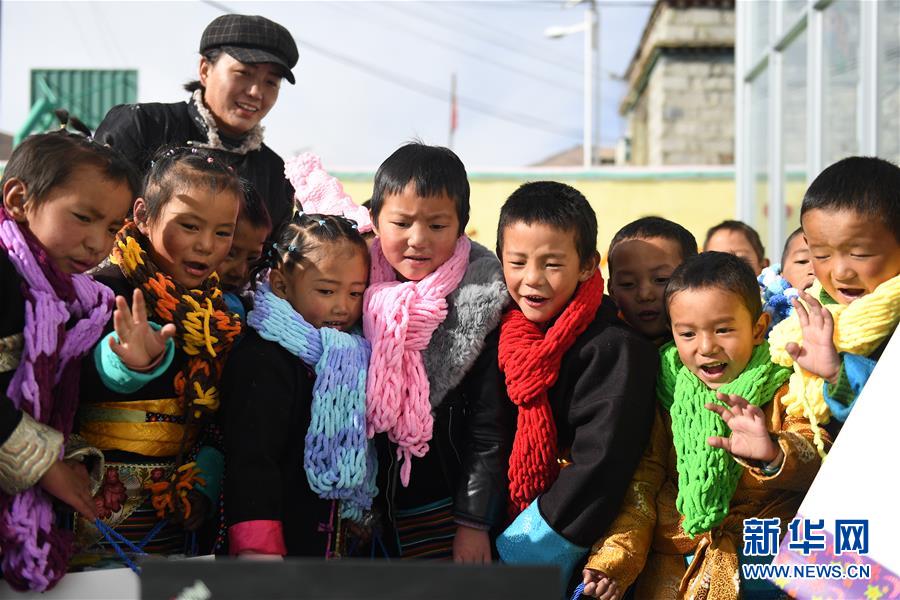 西藏道布龙双语幼儿园的师生与杭州浙大幼儿园西溪分园师生视频聊天,互致问候(2019年12月24日摄)。新华社记者 普布扎西 摄