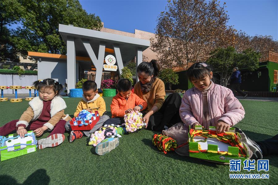杭州浙大幼儿园西溪分园的小朋友在老师的指导下编织围巾(2019年12月11日摄)。新华社记者 徐昱 摄
