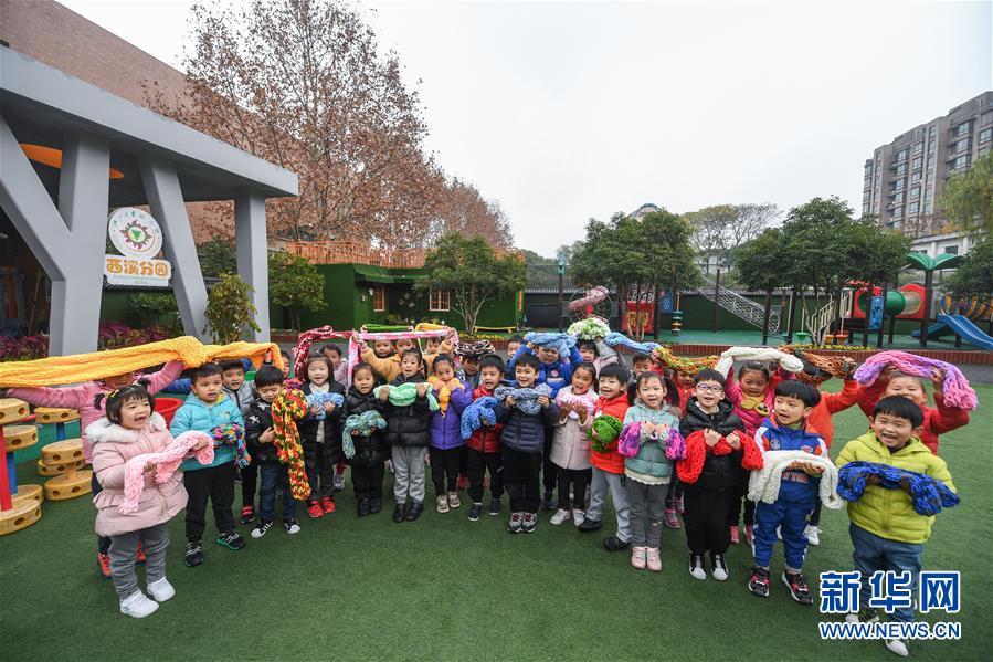 杭州浙大幼儿园西溪分园的小朋友们展示他们编织好的围巾(2019年12月18日摄)。新华社记者 徐昱 摄