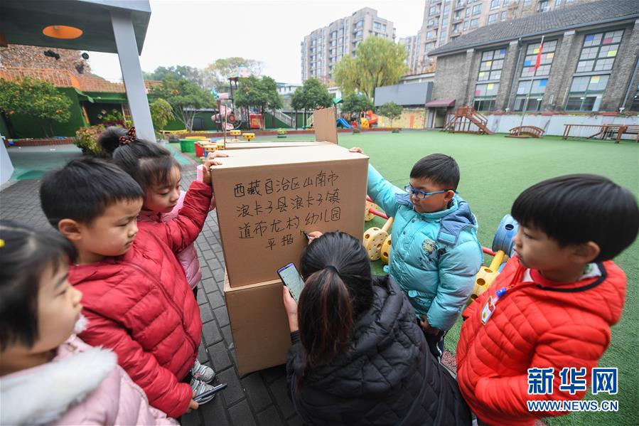杭州浙大幼儿园西溪分园师生将围巾打包装箱,准备寄往西藏山南浪卡子镇道布龙双语幼儿园(2019年12月18日摄)。新华社记者 徐昱 摄