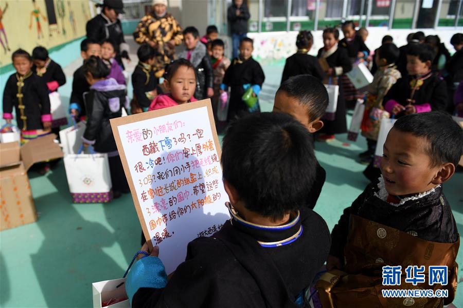 西藏道布龙双语幼儿园的小朋友收到来自杭州浙大幼儿园西溪分园师生写的信(2019年12月24日摄)。新华社记者 晋美多吉 摄