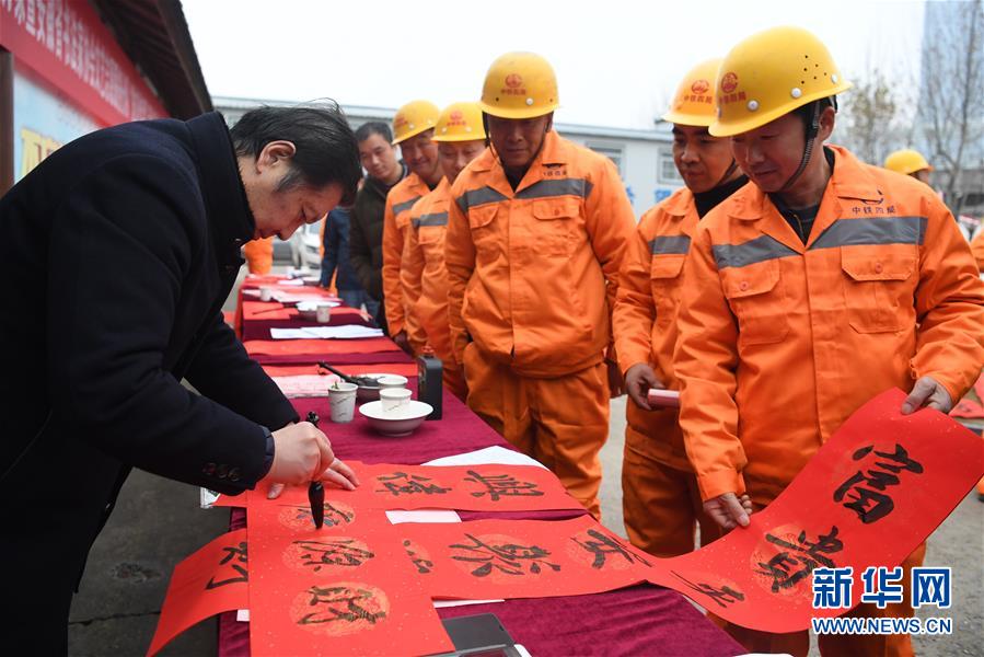 1月3日,书法家在中铁四局合肥地铁5号线工地为农民工写春联。 春节临近,安徽省书法家协会文艺志愿服务队开展“送文化年货”活动,在中铁四局合肥地铁5号线工地为农民工写春联,传递美好祝福。 新华社记者 刘军喜 摄