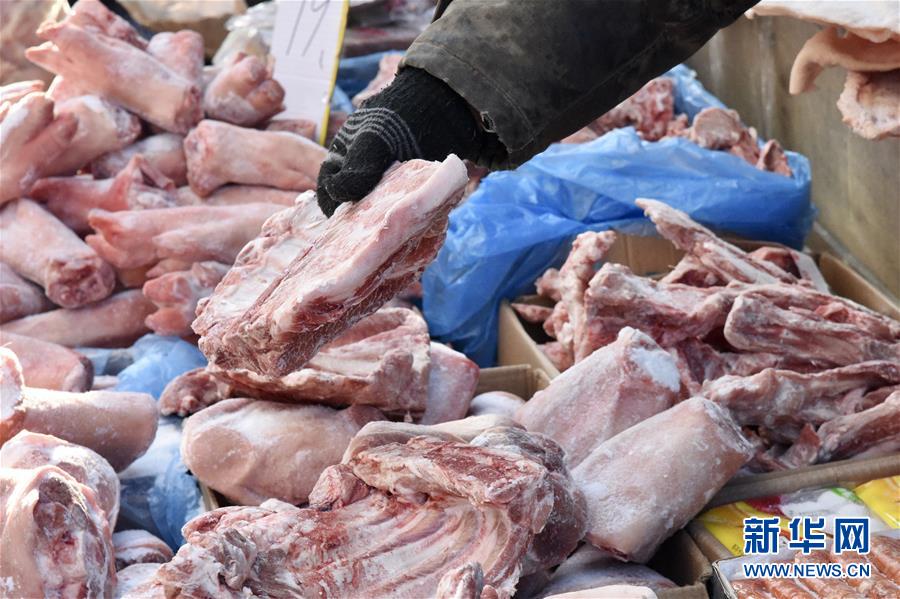 黑龙江省漠河市一处市场的摊主帮顾客挑选冻猪肉(1月2日摄)。新华社发(唐铁富 摄)