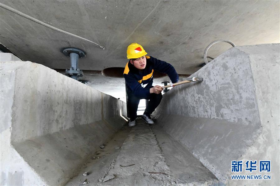 1月3日,中国铁路济南局临沂工务段工程技术员李奔腾在沂河特大桥桥梁连接处检查。新华社记者 朱峥摄